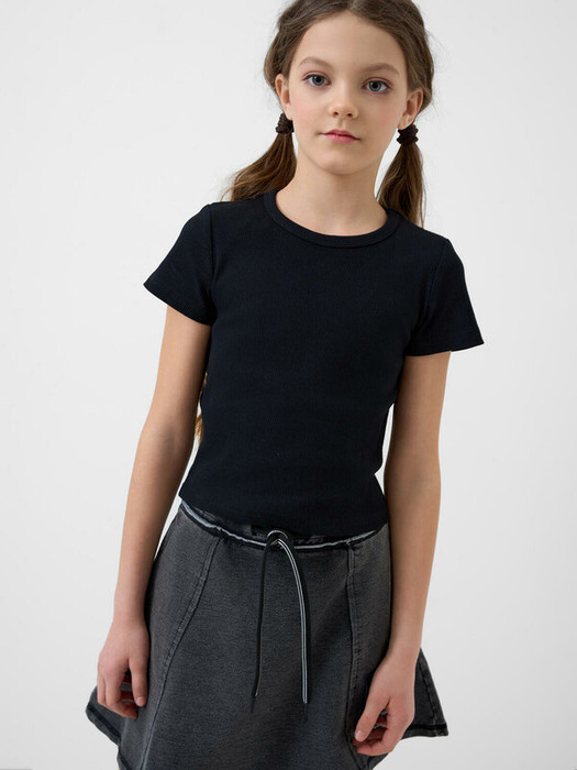 Футболка базовая для девочки подростка. Модель укороченная, выполнена из эластичного хлопкового трикотажа в рубчик. Горловина круглая.