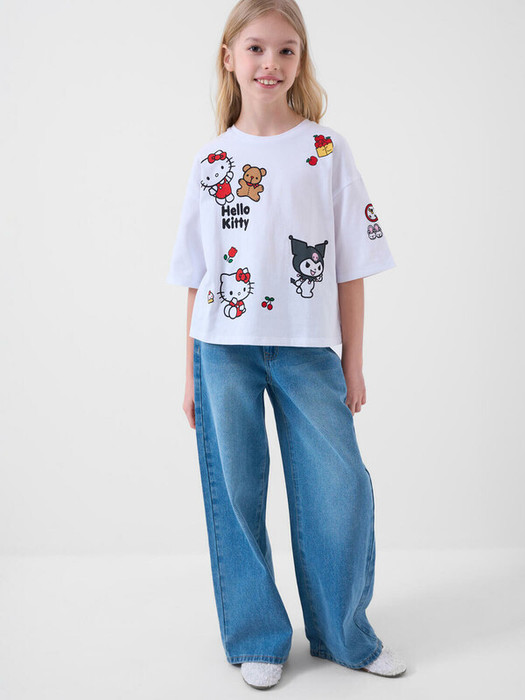 Футболка оверсайз для девочки подростка. Модель выполнена из эластичного хлопкового трикотажа джерси. Яркие принты с любимыми персонажами Хеллоу Китти. Горловина круглая.