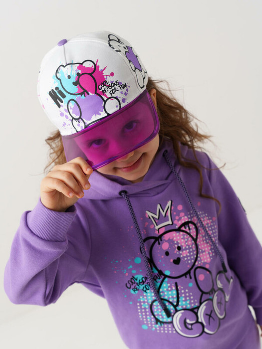 Бейсболка детская для девочки. Стильная модель выполнена из белой хлопковой ткани. Яркий принт с мишками. Изогнутый прозрачный козырек. Регулировка ширины липучкой.