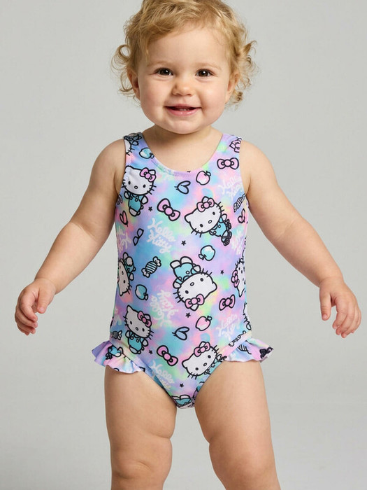 Детский слитный купальник для девочки с ярким принтом Hello Kitty. Модель с открытой спинкой, круглым вырезом спереди и воланами по бокам на бедрах. Вырезы обработаны мягкой эластичной резинкой, обеспечивающей комфортную посадку. Основной фон — радужный, с изображением Hello Kitty, бантиков, сердечек и конфет в розово-мятной гамме. Внутри передняя часть с подкладкой. Благодаря UF-защите, ткань сохраняет первоначальный вид даже при длительном пребывании на солнце. Подходит для плавания и активного отдыха.
