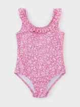 Детский купальник для девочки. Модель выполнена в нежно-розовом цвете и украшена объемными цветочными рюшами, которые создают яркий и праздничный образ. Топ на регулируемых бретелях. Плавки на подкладке средней посадки, также декорированы рюшами по талии. Все края обработаны эластичной тесьмой, чтобы изделие хорошо сидело на теле и не натирало. Благодаря UF-защите, ткань сохраняет первоначальный вид даже при длительном пребывании на солнце. Идеально подходит для пляжа и отдыха летом.