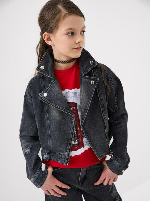 Джинсовая куртка в байкерском стиле для девочки подростка. Изделие выполнено из плотного тёмно-серого денима с декоративными потертостями, высветлениями и рваными элементами. Спереди расположена косая застежка-молния и два кармана на молниях. Воротник с лацканами украшен металлическими кнопками. Рукава с манжетами на кнопках.