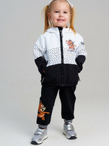 Детская джинсовая куртка для девочки. Застежка по центру на кнопках. Спереди — два накладных кармана с кнопками. На левом кармане и спинке принт с любимыми героями из мультфильма 1101 далматинец. Дополнительный акцент — красная нашивка с цифрой "101" на правом рукаве. Манжеты обработаны эластичной резинкой, а воротник выполнен в классическом стиле. Яркая и запоминающаяся модель с узнаваемым дизайном.