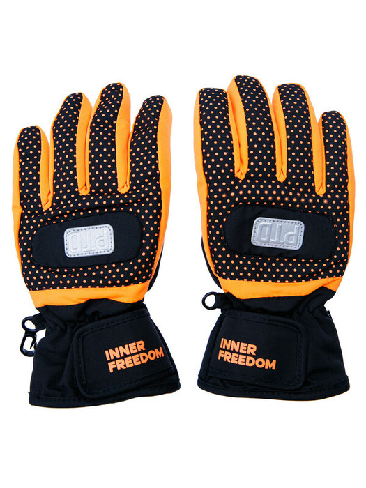 Зимние перчатки с мембраной. Утеплитель – синтепон. Мягкая ладошка из влагостойкого полиуретана. Регулируемая застёжка с липучкой по запястью. Застежка для скрепления пары между собой. Светоотражающие элементы.