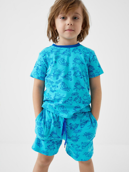 Пижама детская для мальчика. Состоит из футболки, прямого кроя с коротким рукавом и шорт. Модель выполнена из хлопкового трикотажа с принтом Super Wings. Шорты с эластичным поясом и темно-синим шнурком для удобной регулировки.