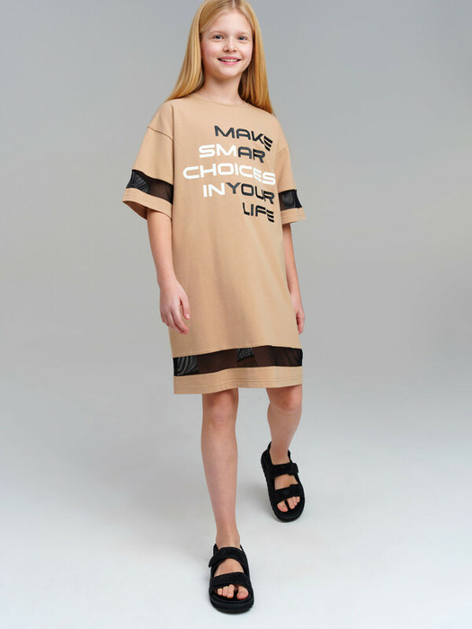 Платье для девочки подростка. Оверсайз платье-футболка из качественного и приятного на ощупь трикотажа джерси. Высокое содержание хлопка 95%. Благодаря наличию эластана в составе ткани изделие проще в уходе и держит форму. Декор из сетки. Модель выполнена из качественного и приятного на ощупь трикотажа.