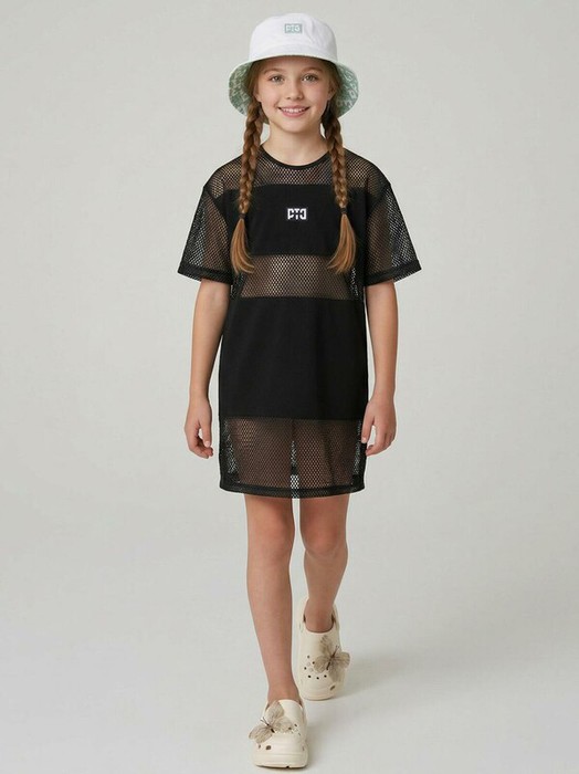 Пляжное оверсайз платье для девочки подростка. Модель в длине мини, выполнена из комбинации хлопкового трикотажа джерси и сетки. На груди размещён небольшой логотип в виде жаккардовой нашивки. Можно составить family look cо взрослым вариантом аналогичного дизайна.