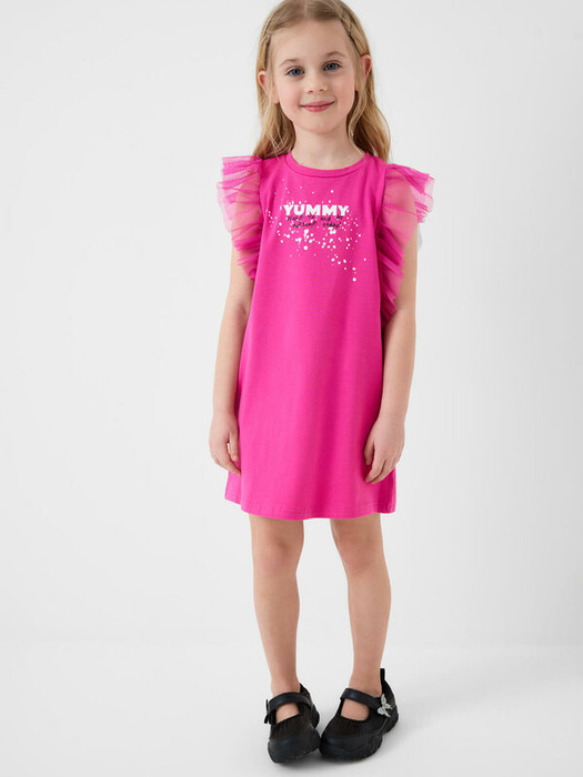 Яркое детское платье для девочки. Выполнено из мягкого хлопкового трикотажа джерси. На груди - красочный принт. По рукавам — декоративные крылышки из лёгкой двухслойной сетки, которые придают образу воздушность. Круглый вырез горловины с аккуратной отделкой. Платье прямого силуэта и укороченной длины — чуть выше колена.