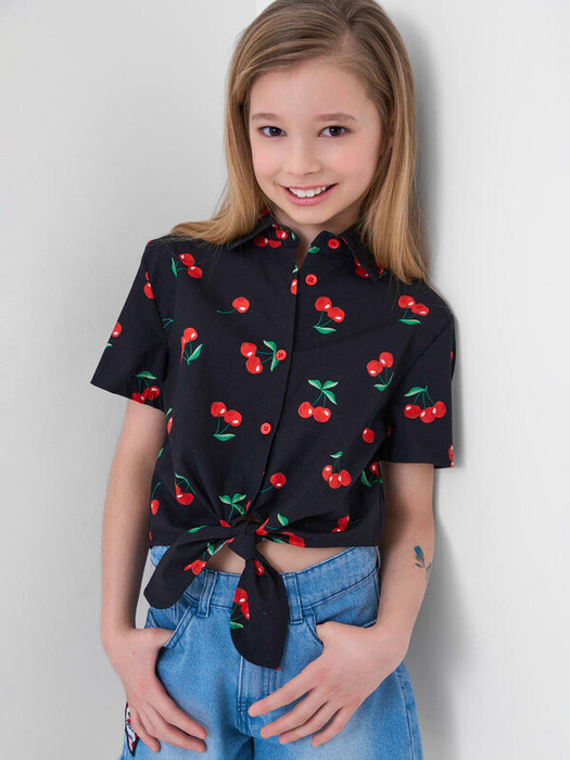 Легкая укороченная рубашка для девочки подростка. Выполнена из хлопковой ткани поплин. Укороченный фасон с короткими рукавами и завязками спереди создает стильный образ. Милый принт с вишнями. Рубашка застегивается на пуговицы и имеет классический воротник. Завязки на талии позволяют регулировать посадку.