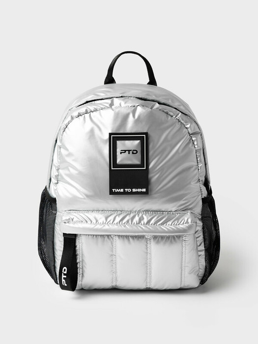 Модный рюкзак из серебристой дутой плащевой ткани для девочки подростка. Рюкзак для школы имеет одно отделение с различными карманами внутри для систематизации школьных принадлежностей. Снаружи  есть большой карман на молнии, сбоку имеются карманы из сетки на резинке. Широкие мягкие вентилируемые лямки регулируются по высоте. У рюкзака есть ручка для ношения в руке и для того, чтобы его можно было вешать на вешалку. Ранец имеет светоотражающие детали на лямках. Рюкзак очень легкий и вместительный. К рюкзаку можно подобрать спортивную сумку в едином дизайне. Размер рюкзака: 30*40*15 см. Вес рюкзака: 470 гр