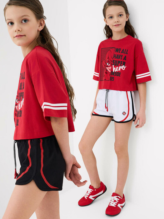 Набор шорт для девочки подростка. Обе модели выполнены в спортивном стиле с короткой длиной и закруглённым краем. Модели из мягкого, хлопкового трикотажа футер. Удобная посадка обеспечивается эластичным поясом со шнуром.