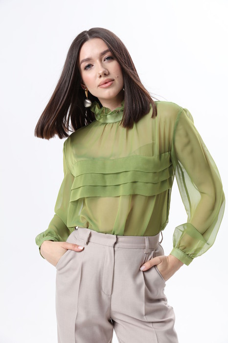 Элегантная блуза из легкой полупрозрачной ткани свободного силуэта. По переду блузки добавлен оригинальный элемент в виде складок, который служит декором, а также скрывает полупрозрачность блузы.