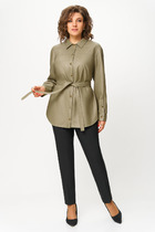 Блузка с высоким воротом стойкой и застежкой на 2 пуговицы. Защипы от воротника по переду. Втачной рукав с манжетой на пуговице.
