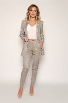 Брюки спортивные, выполнены их трикотажной ткани. пояс и верх брюк выполнн из денима, по середине передей части обработана застежка гульфик с молнией и пуговицей. Деталь из денима по низу не обработан притачныым швом, а имеет необработанный срез с эффектом вытрепанности. посадка брюк -средння по талии, в боковых швах обработаны карманы. брюки очень комфортны в носке