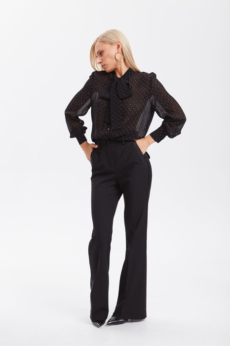 Брюки из костюмной ткани с посадкой на талии, длиной до щиколотки, прямые от середины бедра до колена и слегка расширены  от колена к низу.  Передние половинки с   карманами, наклонными к боковым швам с отделочной планкой  по линии входа в карман,  с  застёжкой на  молнию в среднем шве. Детали спинки с двумя парами талиевых вытачек, и настрочными  клапанами со скруглёнными концами и отделкой по краю. По боковым швам притачные лампасы из отделочной ткани. Пояс-обтачка с застёжкой на петлю и пуговицу, с пятью шлёвками для съёмного пояса.  По передним и задним половинкам заутюжены стрелки.