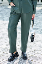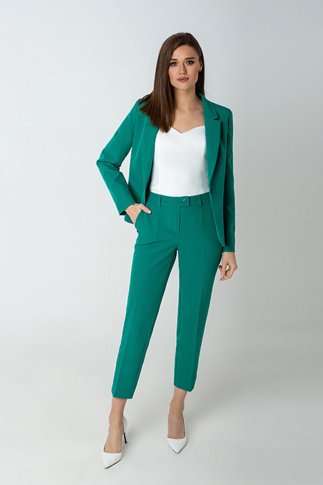 Брюки женские классические, слегка зауженные к низу, с внешней стороны внизу по боками небольшие разрезы. В брюках застёжка на молнию, петлю и пуговицу. Так же спереди имеются боковые карманы, а на задней половинке изделия карманы – обманки. Брюки отлично подойдут для повседневной носки