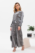 Стильный комбинезон полуприлегающего силуэта с расширенными книзу брюками из струящейся ткани. Комбинезон отрезной по линии талии на резинке, верхняя часть комбинезона на запах. По спинке в среднем шве центральная застежка на потайную молнию. В боковых швах карманы. Рукав цельнокроеный 5короткий на манжете. В комплект входит пояс из основной ткани.