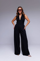 Комбинезон полуприлегающего силуэта. Комбинезон отрезной по линии талии. Лиф переда и спинки с рельефами. В среднем шве спинки вставлена потайная тесьма-«молния». Брюки длинные, широкие. По задним половинам брюк талиевые вытачки. По передним половинам односторонние складки. В боковые швы вставлены отлетные детали, которые переходят в завязки вокруг шей.