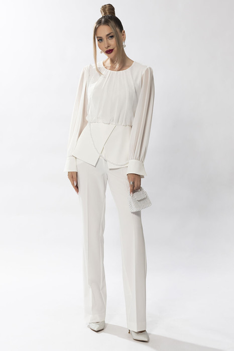 Блузка с застежкой на потайную молнию по среднему шву спинки, без воротника, с круглым вырезом горловины. По горловине переда- сборка. Блузка отрезная по линии талии, с баской. Баска переда состоит из двух фигурных деталей. Шов по талии со сборкой. Рукав втачной, длинный, с отрезной манжетой, застегивающейся на навесную петлю и пуговицу. Окат рукава и шов притачивания манжеты со сборкой. Брюки с отрезным поясом. В области спинки пояс присборен на резинку. Передние половинки с карманами. Вход в карман наклонный к боковому шву. Застежка- гульфик.