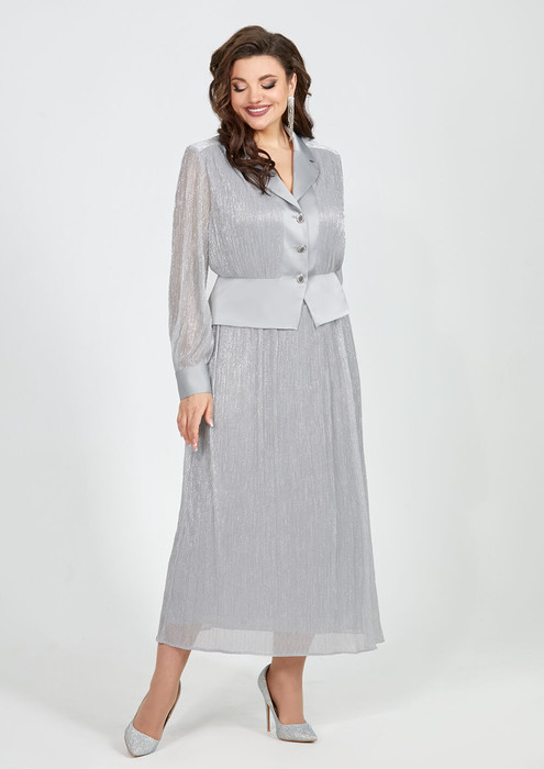 Стильный комплект полу-прилегающего силуэта, выполнен з плиссированной ткани, в качестве отделки атлас. Блузка выполнена в стиле жакета, с застежкой по переду на петли-пуговицы. Горловина обработана воротником пиджачного типа, из атласа. Лиф блузы из плиссированной ткани, до линии талии, по плечевым обработана кокетка, от линии талии вниз притачная баска из атласа. Спинка идентична переда, отрезная по линии талии, с баской, жакет на подкладке. Рукав втачной, из плиссированной ткани, присборен по низу на манжет с застежкой на петлю-пуговицу . Юбка расклешенного силуэта, выполнена из плиссированной ткани, на подкладке, верхний срез обработан притачным поясом на резинке. Элегантный комплект из эффектной ткани прекрасный выбор на любое мероприятие!