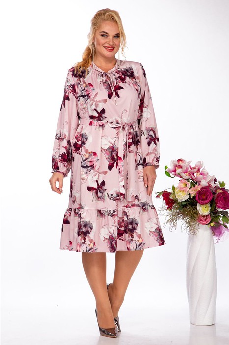 Платье женское выполнено из плательной струющейся ткани, свободного кроя, с плечевыми накладками, по горловине стойка, по низу пришит волан на сборке, платье можно носить как с поясом  так и без пояса, Длина рукава 59 см, длина издеоия 105 см.