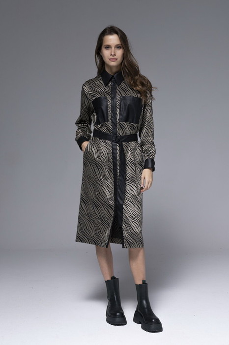 Платье женское из готового трикотажного полотна. Прямого силуэта, длиной ниже колена. Застежка - центральная планка на кнопках, растегивается не до конца. Понизу разрез. Воротник рубашечный, рукав длинный, по низу на кнопках. Карманы накладные с отделочными клепками на уголках. По спинке отрезная горизонтальная кокетка.