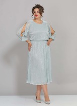 Платье-чулок двухпредметное, верхнее платье из мягкого трикотажног полотна ажурная сетка, длиной до щиколотки, с втачными рукавами длиной до запястья, полуприлегающего силуэта, горловина – цельнокроёная стойка. Перед без особенностей, спинка – с застёжкой «капелька» на две навесные петли и пуговицы. Нижнее платье из трикотажного полотна «масло» прилегающего силуэта, длиной выше линии колена, верхний край платья с эластичной тесьмой для лучшей фиксации и прилегания, перед цельнокроёный, спинка со средним швом.