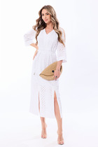 Платье женское прямое длиной до середины икры. Изделие изготовлено из натуральной ткани. Рукав короткий, фантазий ной формы. Украшением платья является красивая вышивка. В боковых швах имеются разрезы и функциональные карманы. Это платье можно носить с широким поясом и без него.