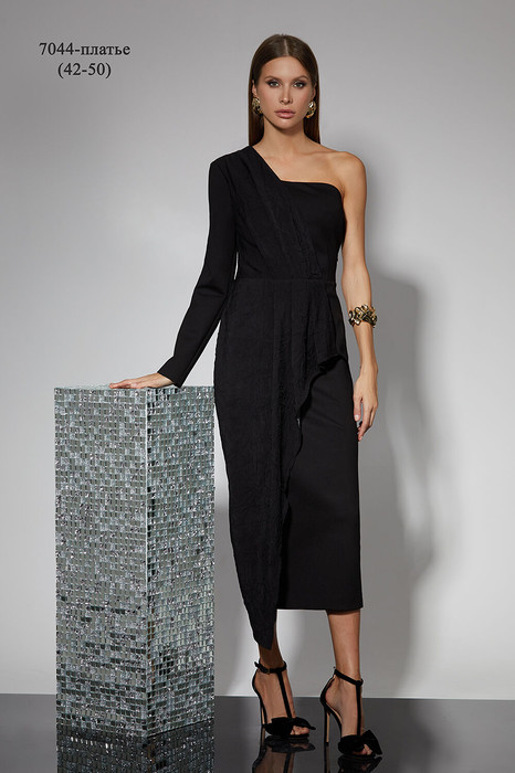 Платье полуприлегающего силуэта. Длина midi. Подрез по талии. Нагрудные вытачки спереди, сзади талиевые вытачки, средний шов и высокий разрез. Молния сбоку. Платье комбинированного кроя с одним рукавом. Декоративная деталь по полочке изделия из отделочной ткани.