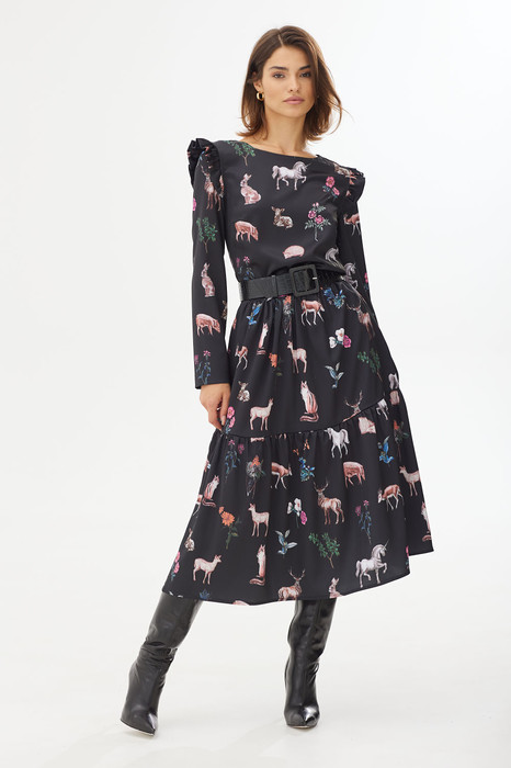 Изящное модное платье из французского крепа. Модель свободной формы полуприлегающего силуэта расширенное к низу. Платье отрезное чуть выше линии талии с двумя ярусами воланов. Линия талии подчеркнута поясом из экокожи.