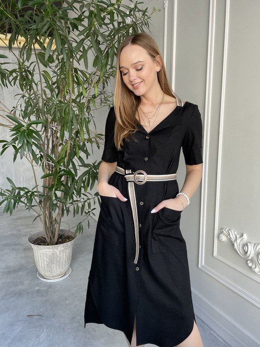 Легкий материл, не сильно мнется. Платье застегивается на пуговицы спереди. Пояс в комплекте.
