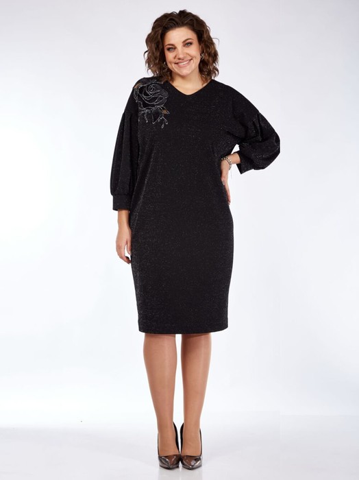 Платье женское из трикотажа с люрексом с дизайнерской вышивкой прямого силуэта, слегка зауженное к низу и со спущенной линией плеча. Горловина V-образной формы с узкой притачной бейкой. Рукав длиной 3/4, в верхней части с односторонними складками, по низу присборен на притачную манжету. Платье длиной за колено. Длина платья - 105 см. Длина рукава - 39,5 см.