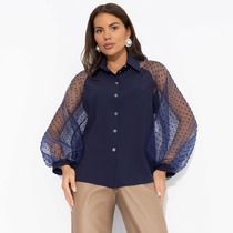 Модная рубашка свободного покроя из хлопкового шитья. Рукав на спущенной пройме, прямой укороченный, с патой и с отворотом. Рубашечный воротник, застежка на пуговицы. По спинке кокетка.