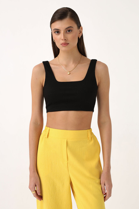 Кроп-топ из трикотажного полотна в рубчик. Модель прилегающего силуэта. Горловина оформлена фигурным вырезом. Топ двойной, не просвечивает.