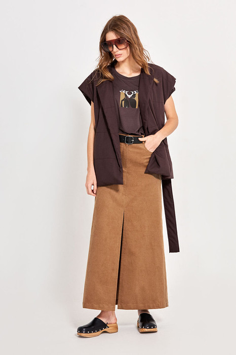 - одна сторона жилета простёгана горизонтальными строчками, на спинке вышивка в виде стрекозы и аппликация с логотипом бренда