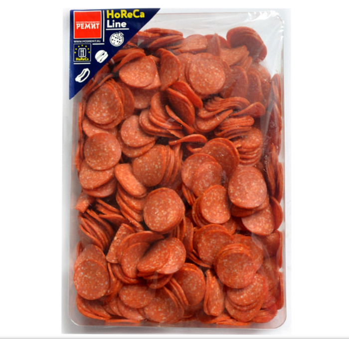 Пепперони нарезана слайсами толщиной по 1,7 мм (вес 10 слайсов – 25 г) и заморожена для удобства использования.