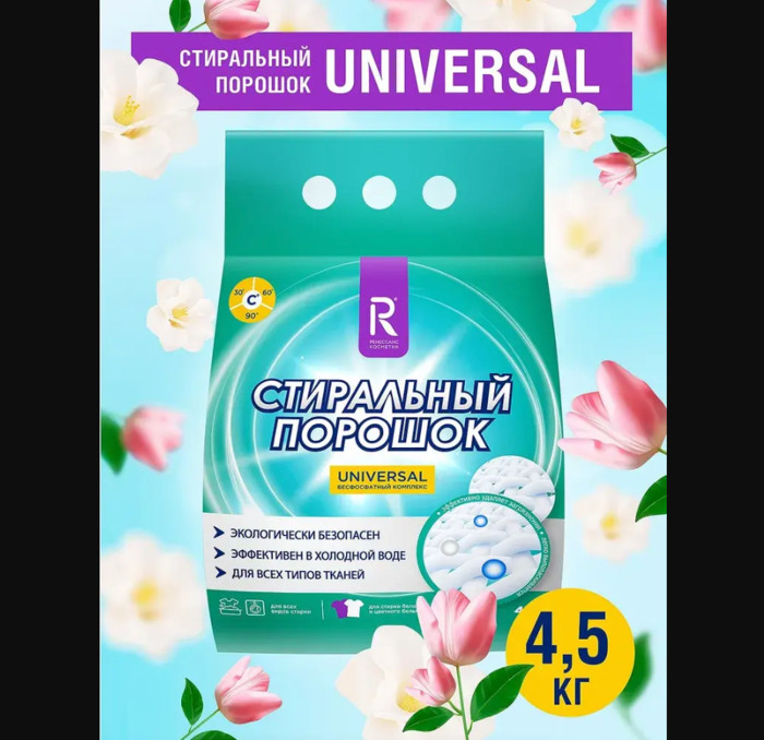Универсальный стиральный порошок от компании Ренессанс Косметик отлично подойдет для стирки цветного и белого белья из натуральных и синтетических тканей.