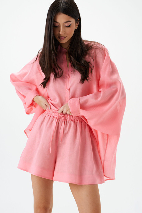 Рубашка свободного кроя выполнена из натурального полотна розового цвета. Характеристики: рубашка прямого свободного кроя, горловина стойка. Застежка центральная на петли пуговицы, рукав акцентный объёмный, крой рукава летучая мышь, спинка отрезная с декоративной сборкой. Длина по спинке 80 см, длина рукава от горловины 76 см.