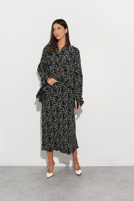 Рубашка прямого свободного кроя выполнена из черного полотна с контрастным цветочным принтом. характеристики: прямой крой, отложной воротник, застежка центральная на петли пуговички, рукав спущен, по переду крупные накладные карманы, в боковых швах разрезы. Длина по спинке 67, длина рукава от края горловины 86 см.