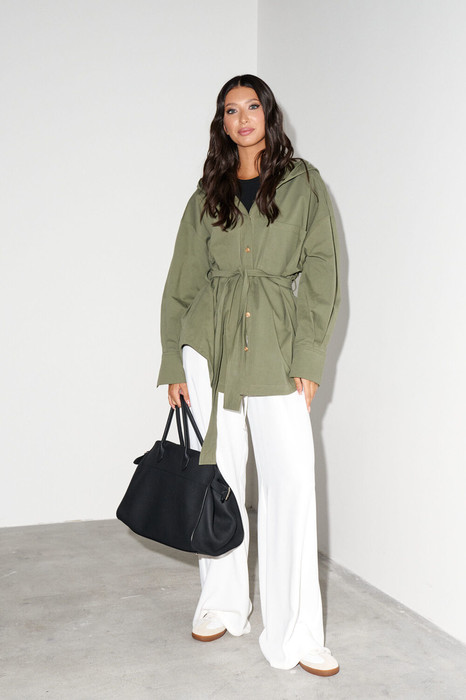 Блузон прямого свободного кроя. Выполнен из мягкого денима цвета хаки. Характеристики: прямой свободный крой, рукав спущеный, по линии талии шлевки, пояс в комплекте. Застёжка центральная на пуговицы, по переду изделия один накладной карман. Над манжетом защипы, манжет застёгивается на три пуговицы. Длина по спинке 75 см, длина рукава от края горловины 73 см.