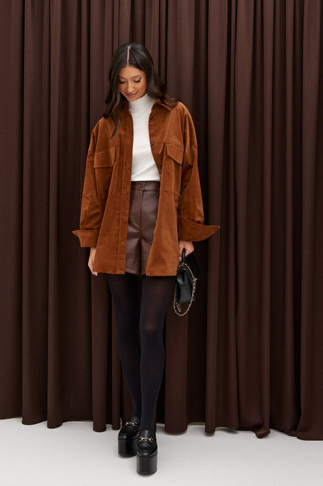 Рубашка прямого свободного кроя выполнена из замшевого полотна. Характеристики: прямой крой, отложной воротник, застежка центральная на планке на петли пуговицы, по переду карманы с клапанами, рукав свободного кроя спущен, по низу рукава манжета на пуговичке, спинка отрезная с декоративной сборкой. Длина по спинке 76 см, длина рукава 80 см от края горловины