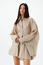 Рубашка из мягчайшего хлопкового муслина, свободного силуэта, застежкой спереди на пуговицы, длинным рукавом и рубашечным воротником. Перед с отрезной кокеткой, накладными карманами и авторскойвышивкой. Спинка с кокеткой и складкой. Рукава с манжетами, длина регулируется хлястиком. Некоторые швы необработаны, что при энзимной стирке придает изделию стильную винтажность.