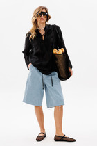 Рубашка свободного кроя выполнена из приятной к телу текстильной костюмной ткани с рисунком, имитирующим трикотажное плетение нитей.  Данная модель – это идеальный вариант для на каждый день. Это модель, с которой можно экспериментировать и создавать множество образов.           Рубашка выполнена в стиле оверсайз. По линии груди декоративные клапаны, по низу декорированные кромкой материала. Рукав имеет спущенную пройму и по низу обработан манжетой с застёжкой на пуговицу. Полочка имеет функцию застёжки на стильные пуговицы. Спинка немного длиннее полочки. Низ изделия декорирован кромкой из основного материала.