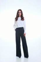 Блуза свободного кроя с отложным воротником на планке с застёжкой на петли – пуговицы контрастного цвета. Рукав со спущенной проймой на манжете. Спинка на кокетке со встречной складкой. Низ спинки имеет фигурную форму.