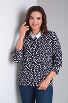 Блузка, комбинированная прямого силуэта, с втачным одношовным рукавом, со складкой и манжетой, с застежкой на петли-пуговицы и спущенной линией плеча. Полочка из трикотажа и рубашечной ткани с центральной застежкой на петли-пуговицы и вышивкой "Самолет". Спинка из трикотажа с печатью "BUTER". Воротник рубашечный отложной на стойке. Спинка и полочка с фигурным низом. Внизу по боковым швам обработаны разрезы.