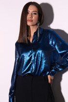 Блузка женская "оверсайз" прямого силуэта. Воротник отложной на стойке. Рукав спущенный с притачной широкой манжетой с отворотом. Разрез рукава обработан планкой. Застежка по переду потайная, на пробивные петли и пришивные пуговицы.