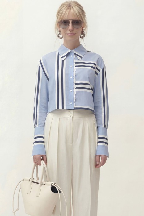 Блуза свободного кроя, укороченная, из хлопковой ткани в полоску. Рукав длинный, спущенный, по низу рукава приточная манжета на застежку петли и пуговицы. Воротник рубашечного кроя с отрезной стойкой. Центральная застежка на петли и пуговицы.