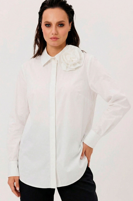 Блуза женская, прямого силуэта с потайной застежкой. Перед с нагрудными вытачками. Спинка с отрезной  кокеткой. Воротник рубашечного типа, с отрезной стойкой. Рукав тачной, одношовный, с манжетой по низу. Низ фигурный. Декоративный цветок (съемный, пуговица)