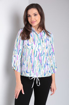 Укороченная рубашка из хлопка прямого кроя со спущенной линией плеча. Горловина обработана рубашечным воротником с отрезной стойкой. Застёжка центральная на кнопки. Есть нагрудные карманы и в боковых швах. Низ рукава обработан притачной манжетой, застёгивается на кнопки.  Изделие без подкладки.