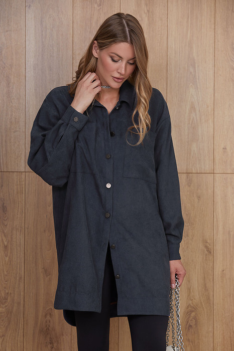 Рубашка прямого силуэта длиной ниже линии бедра, выполнена из вельвета.   Центральная застежка доверху на пуговицы.  Накладные карманы на передних половинках изделия. Отрезная кокетка по спинке.  Спущенная линия плеча, свободный рубашечный рукав со складками внизу. Рукав на притачной манжете.